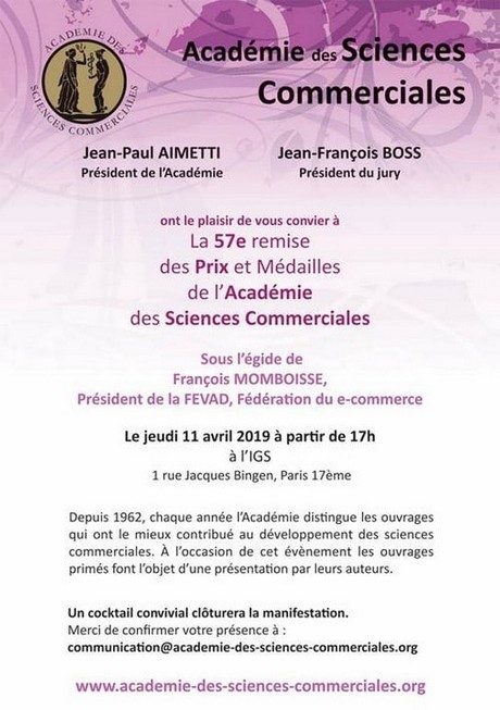 Le 57e remise des Prix et Médailles de l’Académie des Sciences Commerciales – sous l’égide de François Momboisse, Président de la FEVAD, Fédération du e-commerce – aura lieu le jeudi 11 avril 2019 à partir de 17h À l’IGS.