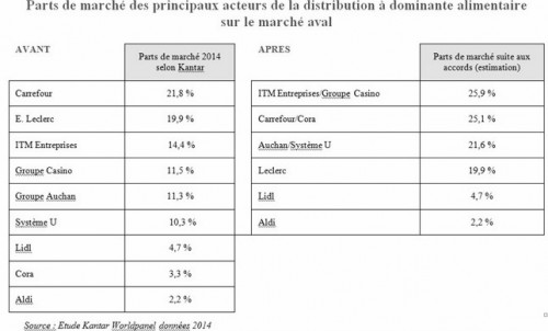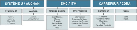 Ainsi successivement, Auchan et Système U, puis, par effet d’entrainement, Intermarché et Casino et enfin Carrefour et Provera ont annoncé leurs rapprochements à l’achat. La multiplication de ces accords a significativement renforcé le degré de concentration et a abouti à la constitution d’une puissance d’achat significative des opérateurs concernés, lesquels disposaient déjà d’un poids significatif au stade de la distribution de détail. Ainsi, à la suite de ces accords, le marché est réparti principalement entre quatre grands acheteurs (ITM/groupe Casino, Carrefour/Cora, Auchan/ Système U et E. Leclerc), qui représentent ensemble plus de 90% du marché.