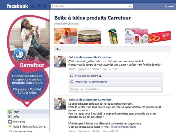 Avec son profil www.facebook.com/boiteaideesproduitscarrefour, carrefour semble vouloir devenir, comme l’annonce la campagne de publicité TV du moment « Une grande marque inspirée, testée et approuvée par vous. »