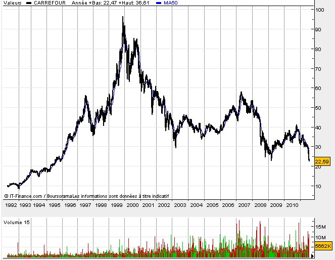 Il est toujours étonnant de voir à quel point la chute du titre Carrefour est importante sur plusieurs années. Nous mettons, en guise de référence, un graphique pour signaler que les plus bas actuels nous ramènent à… 1995, toutes choses égales par ailleurs…