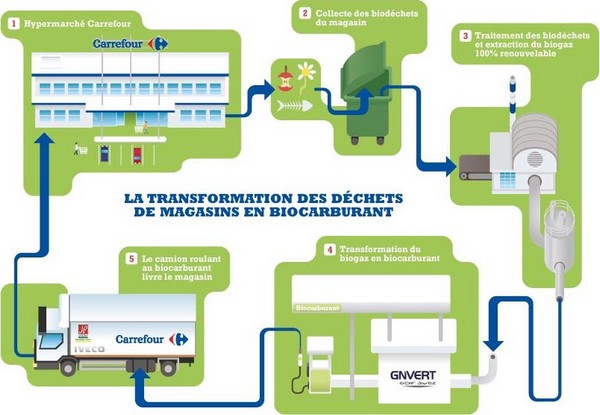 Soucieux de poursuivre son engagement dans le développement durable, Carrefour innove en utilisant le recyclage de ses biodéchets (fruits et légumes, végétaux, pâtisseries, déchets carnés…) pour alimenter en biométhane carburant 3 camions livrant une dizaine de ses hypermarchés de la région lilloise. Concrètement, les biodéchets produits par les hypermarchés concernés sont récupérés, puis traités dans une usine de méthanisation (technologie proche du compostage, mais réalisé en conditions industrielles). Cette méthanisation permet la production d’un biogaz, qui, à son tour, est épuré et transformé en biométhane carburant. Il est ensuite distribué dans l’une des stations GNVERT. Ce biocarburant de 2e génération est utilisé pour alimenter les véhicules de livraison de marchandises dans les magasins Carrefour : la boucle est bouclée !