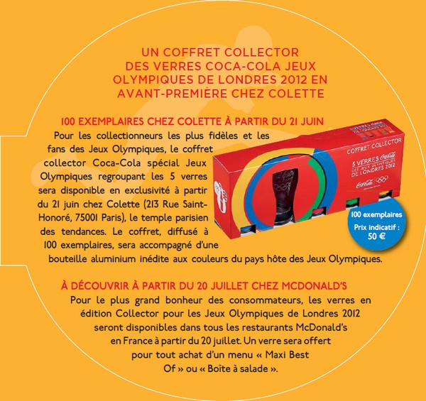 Comme le dit un communiqué du groupe : « Pour le plus grand bonheur des consommateurs, les verres en édition collector pour les Jeux Olympiques de Londres 2012 seront disponibles dans tous les restaurants McDonald’s en France à partir du 20 juillet. Un verre sera offert pour tout achat d’un menu « Maxi Best Of » ou « Boite à salade ». »