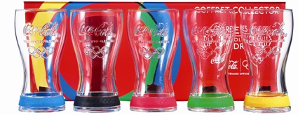 La World Company chère à Canal+ fait son office : 5 couleurs, 5 anneaux, 5 verres Coca-Cola Jeux Olympiques ! Depuis 2004, Coca-Cola crée régulièrement des verres collector à destination du grand public. On en se refait pas, et cela fait plaisir aux petits. Partenaire des Jeux Olympiques de Londres 2012, Coca-Cola a souhaité cette année mettre sa nouvelle collections de verres aux couleurs des 5 anneaux olympiques. Pour l’édition 2012, le design du verre s’inspire de la célèbre bannière olympique : les cinq couleurs représentent les cinq anneaux olympiques entrelacés, symbole des continents et des peuples unis par un même événement universel. Le design est épuré avec une touche vintage et un bracelet détachable sur chaque pied de verre représentant une des couleurs des anneaux olympiques.