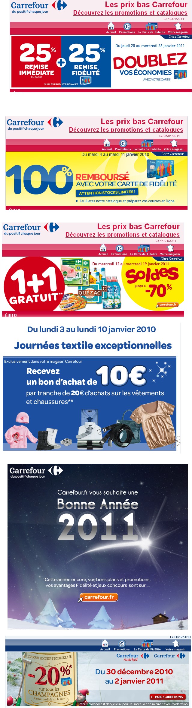 Selon LSA, le distributeur a prévu en 2011 un plan important fondé sur 4 thèmes récurrents chaque mois (un par semaine). Les clients pourront profiter soit d’un – trois produits pour deux achetés -, soit de – un produit acheté, le second à -70%, ou – 25% de remise immédiate et 25% sur la carte de fidélité. Troisième option – 25% de réduction immédiate. Enfin, un produit acheté le second à 25%.