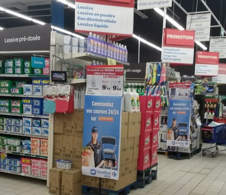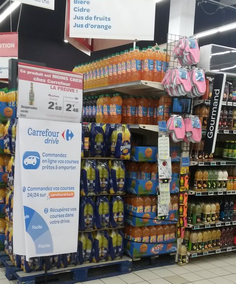 Et on ne risque pas de le louper le drive. Chaque tête de gondole, cachant au passage les produits, présente le Drive accolé à ce magasin d’Île-de-France. Ce ne serait pas un peu trop ?
