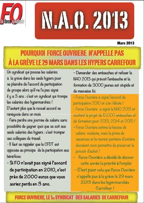 – C’est pour cela que Force Ouvrière n’appelle pas à la grève le 29 mars 2013 dans les hypermarchés Carrefour !
