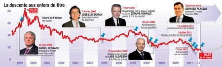 Le plus intéressant est sans doute au centre de l’article. Les propos présentés : « […] Jusqu’à ce que l’ « hidalgo » José Luis Duran soit débarqué en novembre 2008 sur ordre de Bernard Arnault […] allié dans un pacte avec Colony Capital Europe. Et il ne supporte pas de voir le cours de l’action, qu’il a payée aux alentours de 50 euros, s’enfoncer vers les 20 euros, tandis que se multiplient les ‘profit warnings’. L’homme le plus riche de France jettera son dévolu sur un autre étranger, un Suédois, Lars Olofsson, numéro deux du géant de l’industrie alimentaire Nestlé. Trois ans plus tard, ce dernier subira le même sort que son prédécesseur espagnol. » [L’erreur de présentation étant faite ici sur les avertissements sur profits car uniquement l’apanage de Lars Olofsson.]