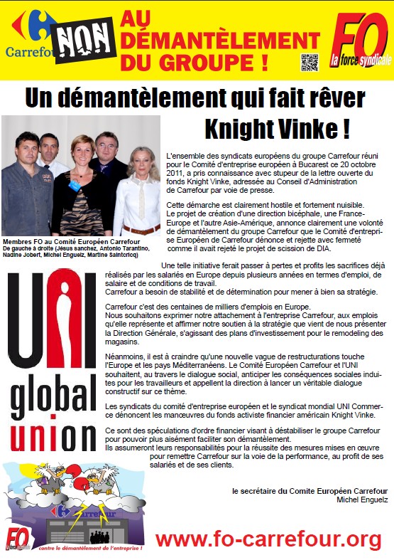 L’ensemble des syndicats européens du groupe Carrefour réuni pour le Comité d’entreprise européen à Bucarest ce 20 octobre 2011, a pris connaissance avec stupeur de la lettre ouverte du fonds Knight Vinke, adressée au Conseil d’Administration de Carrefour par voie de presse.