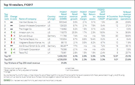 « Cette 22e édition du palmarès annuel des Champions de la distribution, réalisée à partir d’informations publiques sur l’exercice fiscal 2017, identifie les 250 plus grands distributeurs mondiaux, et analyse leur performance en fonction de leur région d’origine et de leur spécialisation. Elle recense également les 50 sociétés ayant connu la plus forte croissance, ainsi que les nouveaux entrants à ce classement. Parmi les acteurs les plus performants figurent les distributeurs de biens de consommation, soit 55,2% des acteurs qui totalisent 66,2% du revenu global des distributeurs mondiaux » précise l’information Deloitte.