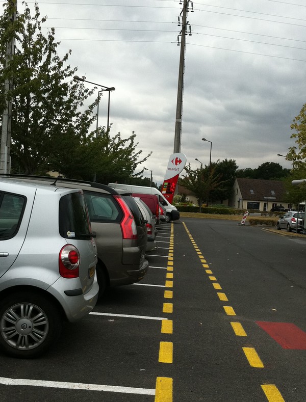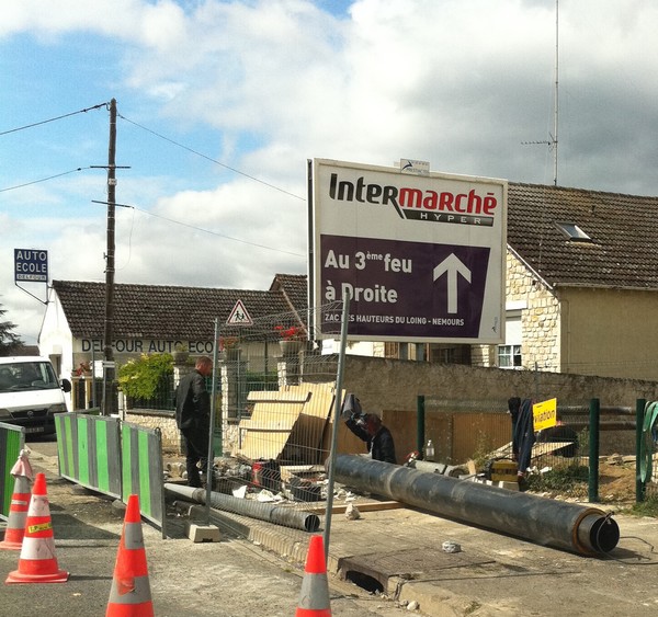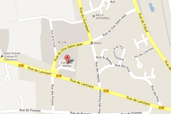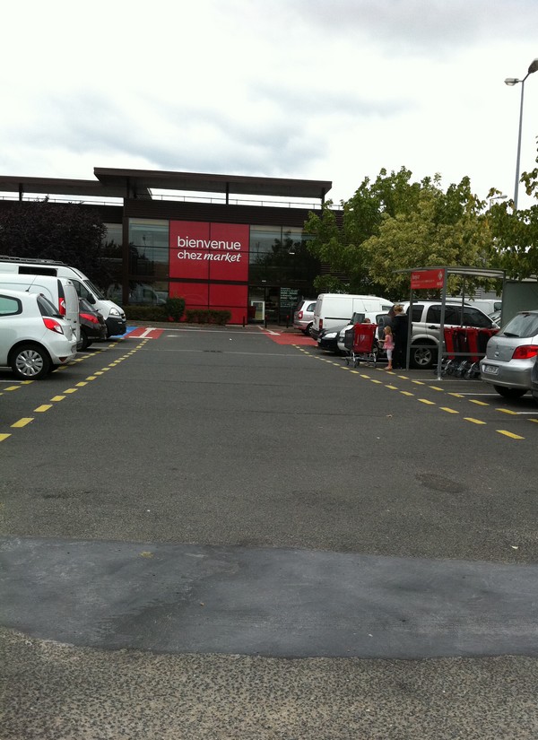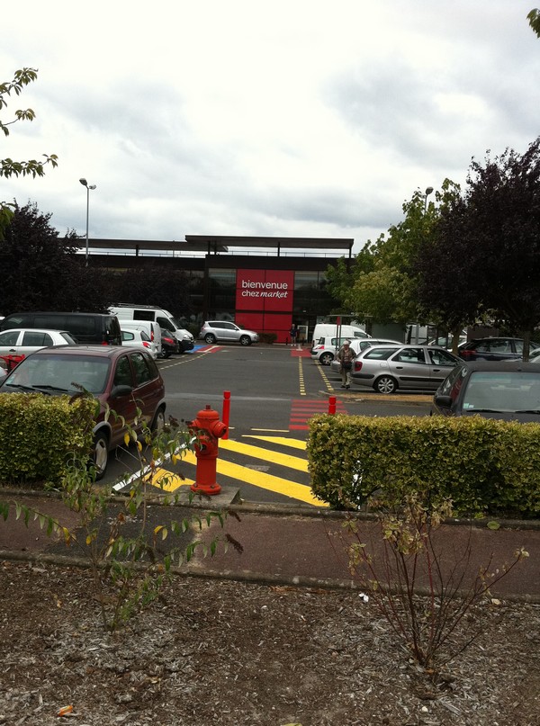 Promenons-nous dans les bois pendant que Le Loup n’y est pas… et nous voilà sur l’autoroute A6, Paris dans le dos, direction NemoursDès la sortie d’autoroute, la concurrence veille… mais point de visibilité pour le magasin sur lequel nous portons toutefois notre attentionPas seulement dans le domaine alimentaire… les pétroliers sont également prochesPas de doute… aucune visibilité du magasin à l’un des principaux croisements… seul le GPS nous indique le chemin à suivre. Dommage !Plan général de l’emplacement. Nous arrivons par la rue de Larchant. La sortie se fait par l’arrière du magasin, rue du Clos Saint-JeanLe magasin est là sur la droite, vous le voyez ? Nous non plus et pourtant c’est bien là !Entre les arbres, il fallait penser à bien tourner la tête… trop compliqué pour les personnes qui passent sans connaître l’existence du magasin et qui n’ont pas de passagers avec eux pour crier Eureka !Il n’y avait que la station service qui avait de la visibilité finalement, au niveau du rond point. Tardif comme visibilité ! (vue prise depuis le parking)L’enseigne ne laisse plus de doute sur l’appellation du magasin. Nous sommes bien chez Market. Les cosmétiques en bonne place, mais en image-prix pas sûr que cela accroche… D’ailleurs, pourquoi continuer à utiliser ce type d’enseigne… Economies et facilité de lecture pousseraient pourtant à utiliser d’autres procédés…L’entrée principale, visible bien que cachée par les arbres. Le sens de circulation, lui, reste un mystère.Les fameux chariots avec support bouteilles qui feront le bonheur des enfants pour sauter dessus et des grands lorsqu’ils seront pliés et que l’on ne pourra plus les ranger…Pas de poubelles, c’est dommage !9h00 – 20h00 en semaine… honorable6000 prix en baisse selon l’affichage, dommage que l’on n’en retrouve pas la couleur en magasin