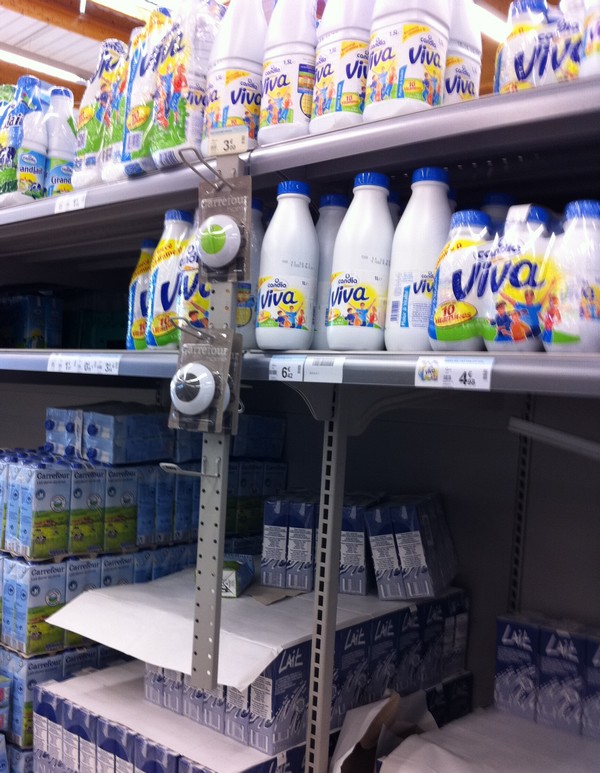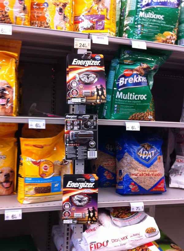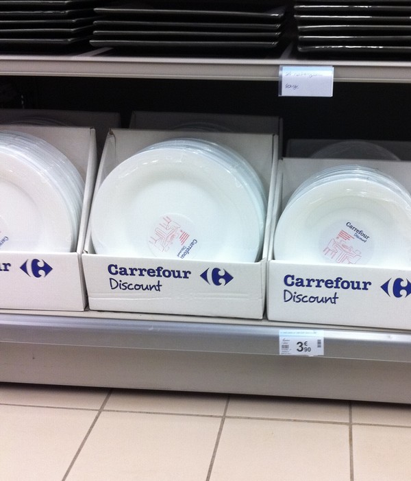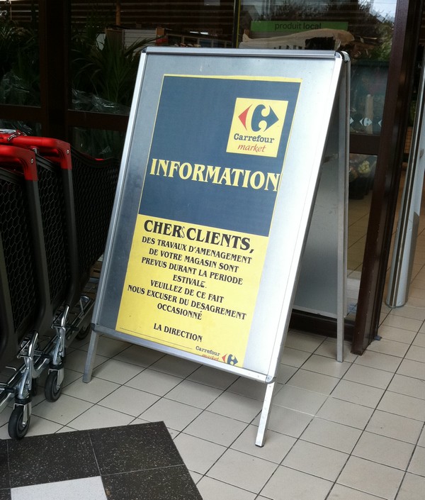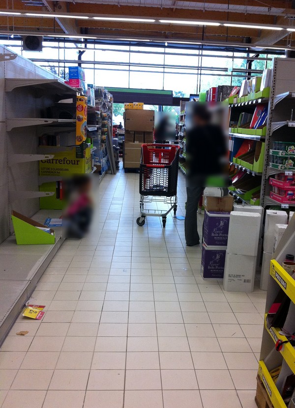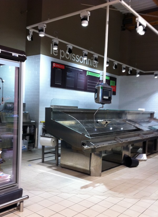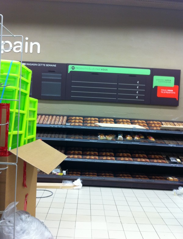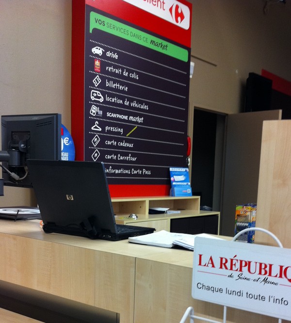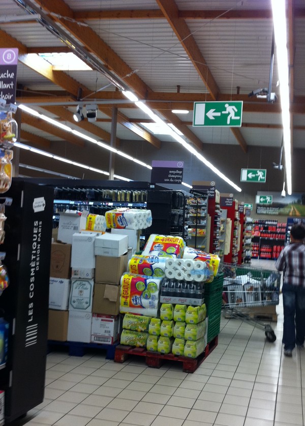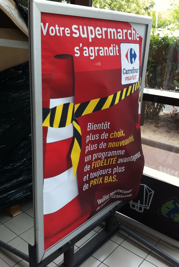 Dernier signe du Carrefour Market… avant disparition complète.Entre la volonté de personnaliser la relation et l’envie de maximiser le chiffres d’affaires, le pluriel balance de manière singulière… Un manque d’accord suite à la période estival(e) ?Des plantes pas très feng shui pour une entrée… Les petits doigts viendront sans doute le faire remarquer à leurs parents.Dans ce market, un scan’phone market… pas très français tout cela ma bonne dame et que signifie cela ?Une entrée sur les fruits et légumes. Une implantation traditionnelle de ce point de vue. On dénote en revanche des étiquetages encore difficiles à comprendre en terme de dénomination. Pour la pesée, voici le nouveau modèle XT (gamme XTRA), du fabriquant Avery Berkel. Pour le moment, pas d’endroit pour mettre les étiquettes sorties à tord, dommageAu fond du magasin à droite, la poissonnerie s’installe, c’est propre et clair.Le rayon poisson en fin de montage et un éclairage de qualitéLa deuxième allée présente des frigos en face à face. Difficile de s’y retrouver de manière intuitive. Le manque de segmentation n’aide pas la reconnaissance de l’offre en raison des reflets. Par exemple, où sont les sandwichs ? Si, si, c’est bien là !Blanc sur fond rose pour le jambon, en haut des armoires, une lisibilité très restreinte pour des meubles de cette taille… et pour tout dire, je n’ai véritablement remarqué ces éléments qu’en regardant les photosOn se bouscule pour entrer… pendant que d’autres cherchent à s’échapperToujours très utile de mettre le dernier du paquet de telle sorte que le prix de l’article du dessus ne soit plus lisible… En revanche, chapeau pour les étiquettes papier qui redonnent de la lisibilité pour les clientsDes étiquettes assez lisibles et des visuels, parfois, qui demanderaient à se multiplier pour facilité le rapprochement entre produits et prixDes téléviseurs, au-dessus des 11 caisses du magasin, présentent l’offre du magasin (nous y reviendrons)Le fromager, on note le pochoir avant peinture. L’ensemble du plafond est de couleur unie marronDevinez ce que c’est devant le lait ?Pour ceux qui rentrent tard le soir, sans doute pour courir avec Médor, des lampes frontales au rayon chien !Un petit mensonge, lorsqu’il n’y a pas de pain, on le voit déjà de loin. Combien de clients se feront avoir ?Pour la rentrée, le rayon fournitures scolaires qui n’est pas encore en place…Une idée géniale pour multiplier à souhait les références, mettre un rayon coulissant devant un autre rayon… dans le bricolage et d’autres encore ! A ne pas vouloir réduire l’offre en fonction des surfaces, les clients seront perdus par cet artificeDes panneaux bien trop petits pour présenter l’offre du magasin…Les marques en bas et les produits Carrefour Discount en haut ! C’est pas l’inverse normalement ?Du textile Plus de Carrefour… étonnant. On connaissait pas une autre marque ?Tu prends une petite mousse avec ton shampoing ?Une verticalisation des marques pour les pâtes ! Intéressant sur la papier et pour négocier avec les fournisseurs sans doute. Les clients seront fâchés pourtant lorsqu’ils voudront comparer les prix… d’autant que les Panzani sont à deux endroits différents ! A rien n’y comprendrePour découvrir l’art du slow drinking, pour les slow-drinker comme ils disent ! Vous avez compris en quoi cela consiste ?Ce qui va être slow, c’est de retrouver ses petits dans un rayon sans segmentation, en revanche un facing de 2 bouteilles par référence, rien à redirePour s’en remettre, un rayon ‘Energy zone’, toujours en français dans le texte… Un réfrigérateur en fait au sein du rayon liquide. C’est joli, mais quelle perte de place pour une offre restreinte !On pensait que les assiettes étaient à 3,60 euros dans tous les magasins… comme quoi le discount n’est pas partagé par tous de la même manière…Devant de caisse traditionnel, et 11 caisses pour un magasin de cette taille. Ne fallait-il pas débuter par doubler cela avant d’envisager le concept ?Une des rares présentation visuelle de Carrefour Discount pour le rayon liquide