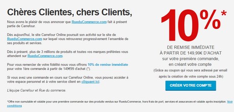 Le propos est ainsi formulé : « Chères clientes, chers clients, nous avons le plaisir de vous annoncer que Rue du Commerce fait à présent partie de Carrefour. Dès aujourd’hui, le site Carrefour Online poursuit son activité sur le site de RueduCommerce.com sur lequel vous retrouverez progressivement l’ensemble de ses produits et services.