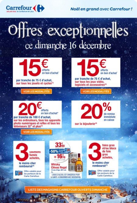 Pour tout achat de jouets, de vélos et/ou de jeux vidéos (hors livres, console de jeux et accessoires cycles) dans l’un de nos supermarchés, Carrefour Market vous offre 15 euros par tranches de 75 euros en bon(s) d’achat à valoir sur vos prochains achats (hors carburant et services). Offre valable le 9 décembre 2012 dans les supermarchés à enseigne Carrefour Market situés en France métropolitaine (ouverts ce jour là).