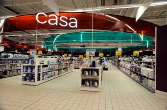 Dans cette radicale restructuration de l’hyper de Paderno, la disposition des espaces et la signalétique ont été élaborées pour faciliter l’identification des produits et optimiser le temps consacré aux courses en privilégiant conjointement le confort des clients. Le magasin présente donc des espaces ouverts, des allées plus larges, des gondoles plus basses, des linéaires plus souples, des lumières douces et des ambiances également pensées pour le confort acoustique.