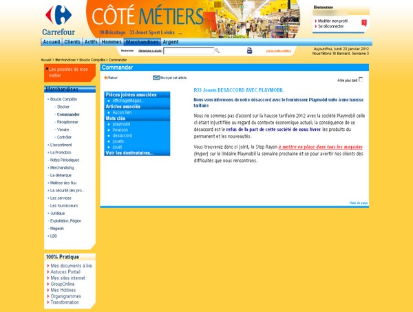 Comme nous l’évoquions dimanche soir 22 janvier 2012, Carrefour Hypermarché est en désaccord avec la société Playmobil. Les magasins sont à présent informés du combat qui s’engage dans les rayons, suite logique de l’information au grand public de la baisse volontaire des prix du groupe Carrefour sur 500 produits de marques nationales, parmi les plus appréciés des Français.
