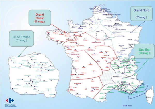Pour comparaison, nous avions évoqué l’organisation qui prévalait jusqu’alors sur un précédent billet et qui avait pour rôle de « redynamiser la politique commerciale ». Nous remettons d’ailleurs à disposition un exemple didactique de l’ancien découpage de la France, concernant les directions régionales des hypermarchés d’attraction (qui rassemblait jusqu’alors 131 magasins). Il fallait d’ailleurs, pour comprendre l’organisation complète, superposer deux autres cartes : celles des hypermarchés de proximité (39 magasins) et celle des très grands hypermarchés (35 magasins). En voici l’illustration…