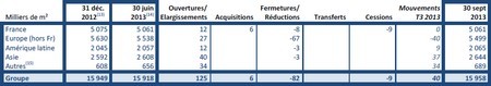 Au troisième trimestre 2013, en brut, Carrefour a ouvert ou acquis 131.000 m² et 315.000 m² sur les neuf premiers mois. Net des cessions ou fermetures, le parc a augmenté de 40.000 m² au troisième trimestre 2013 et s’est agrandi de 9.000 m² sur les neuf premiers mois.