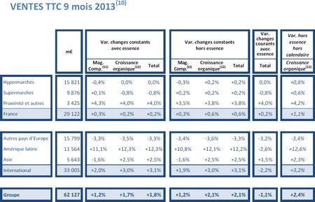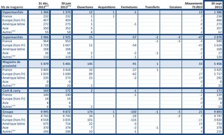 Au troisième trimestre 2013, Carrefour a ouvert ou acquis 175 magasins (+497 sur les neuf premiers mois). Net des cessions ou fermetures, le parc a augmenté de 21 magasins au troisième trimestre 2013 (-102 magasins sur les neuf premiers mois).