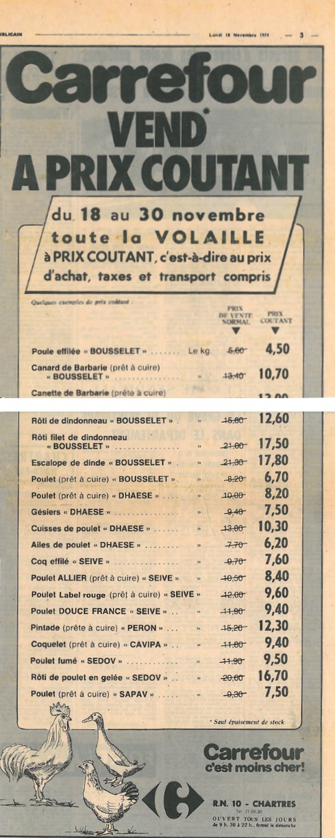 Voici ci-dessous un document qui nous est remis par la direction d’Agro-Média, un support internet spécialisé en agro-alimentaire, à propos de la vente de volaille. Document du 18 novembre 1974 publié dans l’Echos Républicain. Alors, les magasins Carrefour achetaient auprès des producteurs locaux pour mettre en avant la qualité de leur marchandise… Il paraît que cela revient à la mode chez des concurrents naturellement décentralisés mais en évoquant la responsabilité du consommateur… n’est-ce pas à l’inverse d’abord celle du commerçant ?