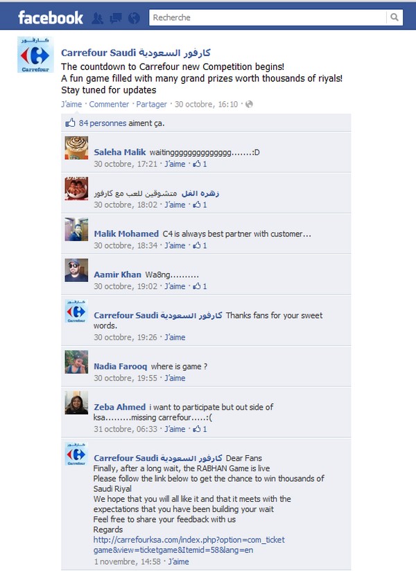 Depuis, disparition du jeu… Pour ceux qui veulent suivre cette affaire et les aventures de RABHAN en ligne http://www.facebook.com/Carrefoursaudi