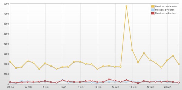 On savait l’entreprise Carrefour de plus en plus orientée sur les nouvelles technologies. Ce que l’on imaginait pas encore c’est la différence importante de notoriété comparée avec « Leclerc » et « Auchan » sur la période actuelle. Sans doute le pic du 16 juin 2012 est-il lié à l’assemblée générale du groupe du 18… mais tout de même ! A suivre dans les prochains mois.