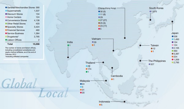 Dirigé par Monsieur Motoya Okada, Président, le groupe est présent dans 12 pays asiatiques. Son nom est dérivé du latin aeon signifiant « éternité », ou encore du grec aiôn : « vie, éternité, entité divine ». Avec un philosophie présentant « Le client d’abord », Aeon renforce à ce jour sa position sur les marchés sur lesquels il s’établit, notamment par une identité de marque plus claire.