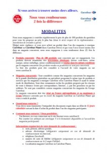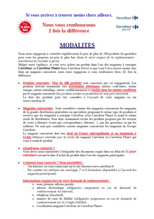 « Nous nous engageons à contrôler régulièrement le prix de plus de 500 produits du quotidien pour vous les proposer au prix le plus bas (dans le strict respect de la réglementation – interdiction de revendre à perte). Malgré notre vigilance, si vous avez acheté un produit dans l’un des magasins à enseigne Carrefour ou Carrefour Planet (hors Carrefour Drive) et que vous l’avez trouvé moins cher dans un magasin concurrent, nous nous engageons à vous rembourser deux (2) foisla différence.