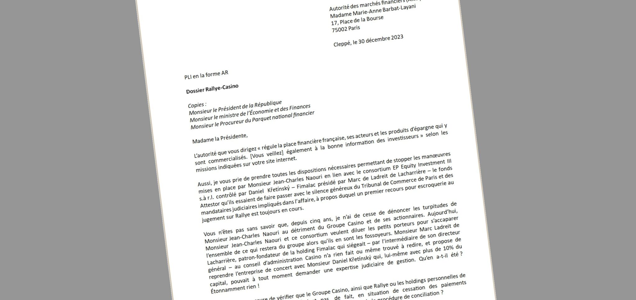 Aussi, je vous prie de prendre toutes les dispositions nécessaires permettant de stopper les manœuvres mises en place par Monsieur Jean-Charles Naouri en lien avec le consortium EP Equity Investment III sàrl contrôlé par Daniel Křetínský – Fimalac présidé par Marc de Ladreit de Lacharrière – le fonds Attestor qu’ils essaient de faire passer avec le silence généreux du Tribunal de Commerce de Paris et des mandataires judiciaires impliqués dans l’affaire, à propos duquel un premier recours pour escroquerie au jugement sur Rallye est toujours en cours.