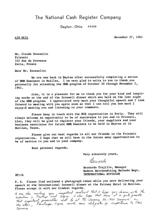 Après son voyage à McAllen, au sein des séminaires MMM, Claude Brosselin – alors controleur de gestion chez Prisunic – recevra ce courrier de remerciements de la part de Bernardo Trujillo, qui – pour lui –