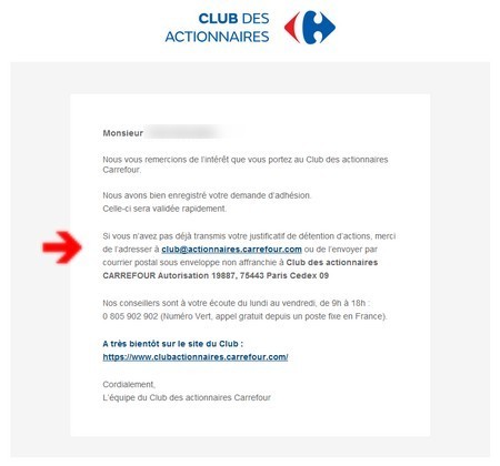 Pour les inscrits, le Club des actionnaires Carrefour peut être contacté au même numéro téléphonique ou par courrier postal :