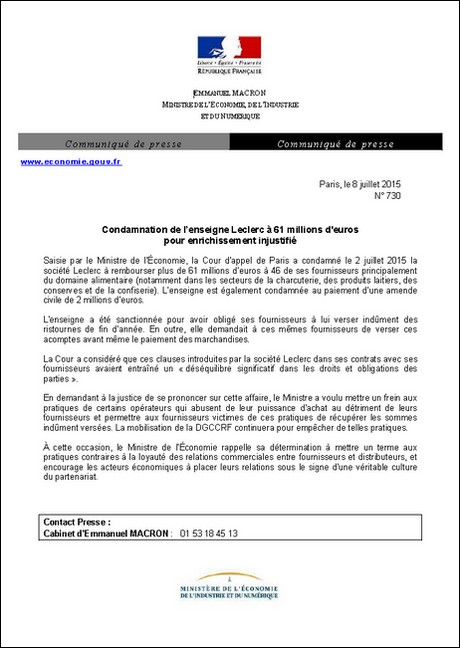 Selon le communiqué du Cabinet d’Emmanuel Macron, Ministre de l’Économie, de l’Industrie et du Numérique : « Saisie par le Ministre de l’Économie, la Cour d’appel de Paris a condamné le 2 juillet 2015 la société Leclerc à rembourser plus de 61 millions d’euros à 46 de ses fournisseurs principalement du domaine alimentaire (notamment dans les secteurs de la charcuterie, des produits laitiers, des conserves et de la confiserie). L’enseigne est également condamnée au paiement d’une amende civile de 2 millions d’euros.