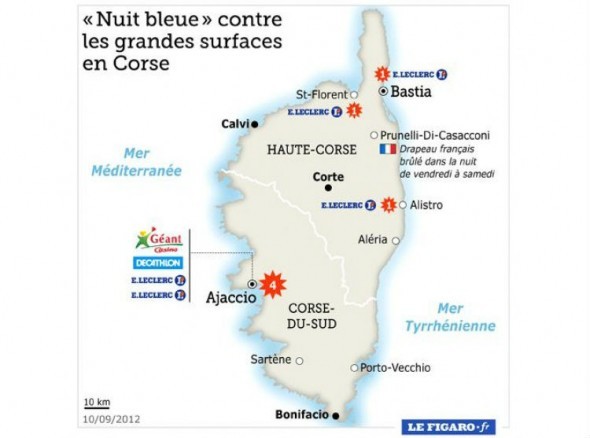 Sur 7 magasins, 5 Centres E.Leclerc ont en effet été touchés, deux à Ajaccio et les trois autres en Haute-Corse (Bastia, Alistro et Saint-Florent). Deux autres enseignes ont également été concernées : l’hypermarché Géant Casino et le Décathlon d’Ajaccio, ouvert cette année. Selon nos propres sources sur place, ces actions restent incompréhensibles et suscitent l’indignation, d’autant que les affaires visées étaient tenues par des insulaires.