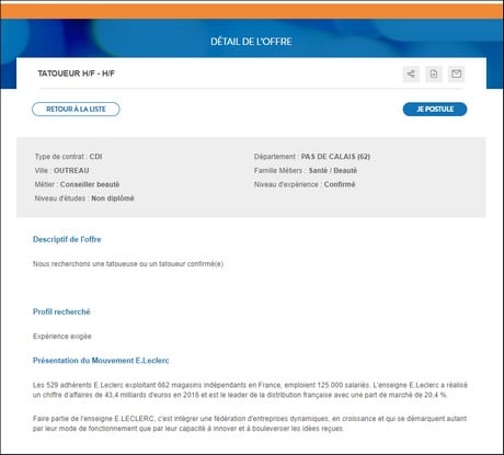 Comme le précise le communiqué d’une association de tatoueurs professionnels : « C’est bien sur le site d’E.Leclerc, principal concurrent de Carrefour et employeur de plus de 100 000* personnes, qu’on trouve désormais des offres de recrutement pour les tatoueurs. L’offre est publiée dans la cadre du « Mouvement E.Leclerc », décrit par la société comme « une fédération d’entreprises dynamiques, en croissance et qui se démarquent autant par leur mode de fonctionnement que par leur capacité à innover et à bouleverser les idées reçues« .