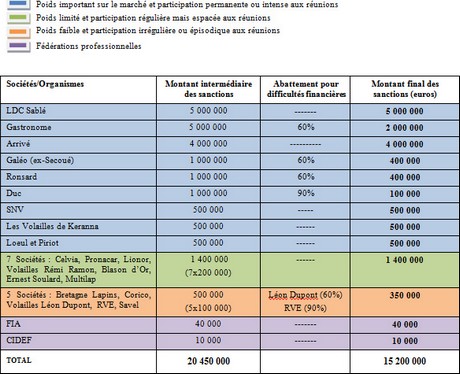 Par ailleurs, deux organismes professionnels et une quinzaine d’entreprises ont été, soit mis hors de cause pour insuffisance de preuves de leur participation à l’entente, soit exonérés de sanction du fait notamment de leur liquidation judiciaire en cours de procédure ou de leurs grandes difficultés financières, ce qui est notamment le cas de Doux, acteur majeur du secteur au moment des pratiques.