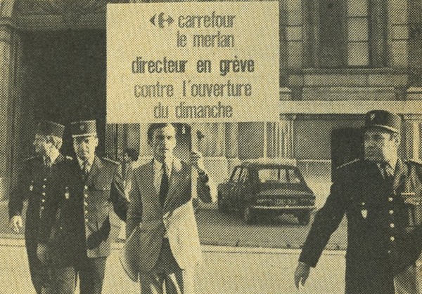 Une vision légèrement différente, il y a quelques années… un certain 18 octobre, « Humbert Fournier, directeur du Carrefour-Merlan, près de Marseille (et fils de Marcel Fournier), a fait sensation en faisant la grève tout seul : « J’étais appuyé par l’ensemble de mon personnel qui m’a manifesté son soutien… en continuant à travailler » [disait-il alors] ». Autre vision encore, Tesco Métro à Londres ouvert 24h/24 et 7j/7 en zone touristique et Mark et Spencer du lundi au vendredi uniquement en zone .