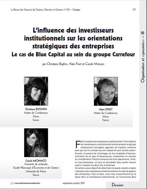 Cet article de Christiane Bughin, Alain Finet et Carole Monaco, traite de la notion d’activisme des investisseurs institutionnels. Dans un premier temps, dans une revue de la littérature, les auteurs se sont concentrés sur les travaux menés par M. Aglietta (en 2008). Celui-ci définit deux types d’investisseurs, d’une part, en fonction de leur horizon temporel de placement et, d’autre part, en fonction de leur influence sur le mode de gestion des entreprises. Ils ont ensuite différencié deux types d’investisseurs : les investisseurs institutionnels de court terme et ceux de long terme, leur mode d’incidence sur les firmes contrôlées étant contingent à l’horizon temporel de leur placement. Dans un second temps, ils ont analysé l’influence d’un investisseur institutionnel spécifique, Blue Capital en l’occurrence sur la gouvernance d’entreprise d’une entreprise particulière, Carrefour. De la sorte, ils ont évalué le niveau d’activisme de Blue Capital (par l’intermédiaire du Conseil d’Administration de Carrefour, les administrateurs représentant Blue Capital faisant partie d’un réseau social dense) et déterminé les raisons des différents changements opérés au sein du groupe Carrefour depuis l’arrivée de Blue Capital. Mots-clés : Investisseurs institutionnels, Activisme Institutionnel, Gouvernance d’Entreprise, Conseil d’Administration.