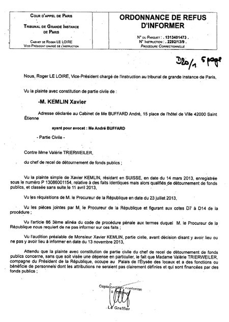 Nous continuons la diffusion d’information, finalement jamais loin de Carrefour… Il ne s’agit pas là de revenir sur les pétitions qui circulent sur le net. Plutôt, nous avions évoqué l’instruction de la plainte de Xavier Kemlin contre Valérie Trierweiler, notamment dans le cadre de son statut de la 1re Dame. Contrairement au journal Le Point – très mal informé selon nos sources… pour le moins – Xavier Kemlin vient d’être destinataire, par le biais de son avocat Maître André Buffard, d’une ordonnance de refus d’informer reprenant quasiment mot à mot la position du Parquet.