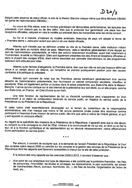 Il est inadmissible de s’appuyer vaguement sur des pratiques américaines pour justifier la légitimité de Mme Trierweiler à la fonction de première dame en France. Mme Michelle Obama est l’épouse du président; elle est aussi la mère des 2 filles du couple. Aux USA, les épouses des candidats sont largement impliquées dans la campagne présidentielle et les électeurs votent donc en connaissance de cause. Je doute que les électeurs américains acceptent une première dame qui ne soit ni l’épouse du président, ni la mère de ses enfants. Je doute même qu’un homme politique avec une telle situation familiale soit désigné candidat à la présidentielle. Le compte rendu du juge Le Loire est inadmissible de part son manque de rigueur et de transparence; à l’image du président Hollande, finalement. De plus il est contradictoire avec les actions de Trierweiler qui a pris position contre Hollande pour supporter le rival de Ségolène Royal aux législatives. Des sanctions? Mme Trierweiler s’est également exprimée publiquement lors de l’affaire Loanna. Des sanctions? Je supporte la démarche de Xavier Kemlin et j’espère que son appel aboutira à une définition claire et rigoureuse de la fonction de première dame et à la publication du patrimoine de celle ci.