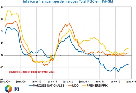 Dans la grande distribution, les prix des produits suivent une tendance baissière depuis trois ans. La déflation se poursuit en décembre 2015, pour le 30e mois consécutif. (source IRI)