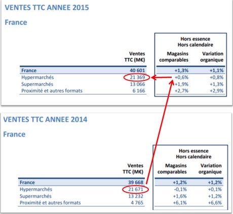On se doutait bien que Les Echos, cher à Bernard, n’allaient pas non plus tirer sur l’ambulance… alors autant le jouer en escadrille avec le Figaro, qu’affectionne Papy Marcel. C’est finalement la même histoire tout cela. Avec le titre « Carrefour, vente 2015 en hausse de 2,7% » on a juste perdu 2,7% au passage avec le chiffre sur-vendu par le communiqué de presse de +5,3% hors essence à changes constants et +3,0% en organique, pour les chiffre d’affaires à 86,3 Md€ pour le groupe.