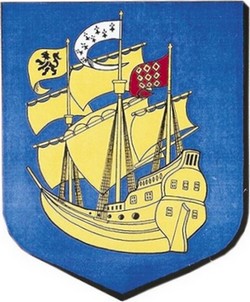 Le blason de Landerneau a sans nul doute la source d’inspiration avec comme base essentielle l’azur, le banc et l’or qui deviennent bleu-blanc et orange chez le distributeur.