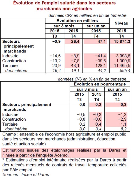 Inversement, l’emploi du secteur tertiaire dans son ensemble accélère au quatrième trimestre 2015 (+0,4 %, soit +43 100, après +0,2 % au troisièmetrimestre). Hors intérim, l’emploi du secteur tertiaire accélère également (+0,2 %, soit +23 900, après +0,1 % au trimestre précédent). Sur un an, l’emploi marchand hors intérim est quasi stable (+2 900).