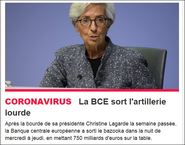 L’autre problème cela va être la phase d’après… car à endetter chaque européen sans lui demander son avis, c’est toute notre économie qui sera secouée. On nous parle de guerre à tout va sans passer par l’Assemblée Nationale, voilà maintenant que l’on nous sort le bazooka, dixit la presse.