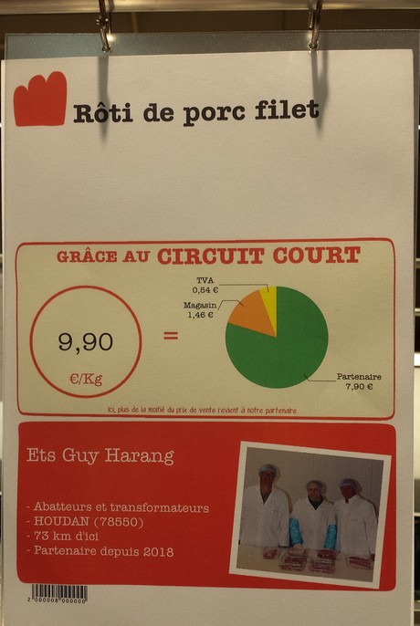 La distance du magasin au fournisseur est indiquée. En effet, 73,7 km… selon ViaMichelin. De là à connaître l’élevage ? implanté en France… C’est d’ailleurs le seul abattoir d’île-de-France, que des associations apprécient d’ailleurs. C’est dans ce genre de filière que l’on aimerait remontrer la chaîne de valeur… car pour la viande le circuit-court est-il une bonne dénomination ?