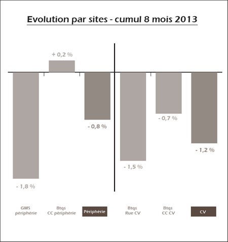 L’activité du commerce spécialisé a connu un léger rebond cet été. Elle reste négative, en cumul à 8 mois (par rapport à 2012, à période et périmètre comparables), selon l’enquête de panel mensuel de Procos (50 enseignes interrogées sur leurs performances dans 50 pôles de référence, situés dans 15 agglomérations). Cette baisse se réfère elle-même à un historique défavorable : le cumul à 8 s’établissait à – 0,6 % en 2012.