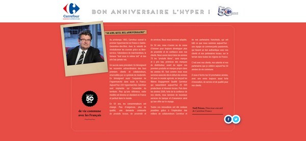 Une mise en avant des équipes ? Une mise en avant du directeur des hypermarchés ? Une mise en avant du concept ? Non, rien de tout cela. Un petit mot de Noël Prioux à l’occasion, pour expliquer les différences entre hier et aujourd’hui : « 50 ans, quel bel anniversaire ».