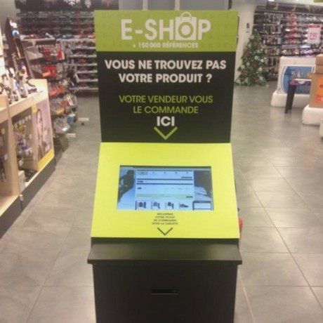 « Vous ne trouvez pas votre produit, votre vendeur vous le commande ». Grâce à la borne e-shop, le vendeur répond à toutes les demandes client en accédant à l’ensemble des offres du site e-commerce. Le produit est ainsi directement commandé sur la borne, réglé en caisse puis livré en magasin ou au domicile du client.