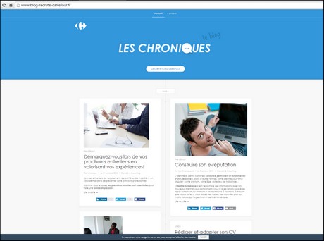 Carrefour vient de mettre en place un www.blog-recrute-carrefour.fr L’ambition du blog-recrute-carrefour Comme le précise le support : « Le blog « Les Chroniques » de Carrefour est animé par des experts et des recruteurs de l’Espace Emploi de Carrefour France. Ce site communautaire est ouvert à tous, où l’on échange sur des sujets de fond pour vous aider … Lire la suite