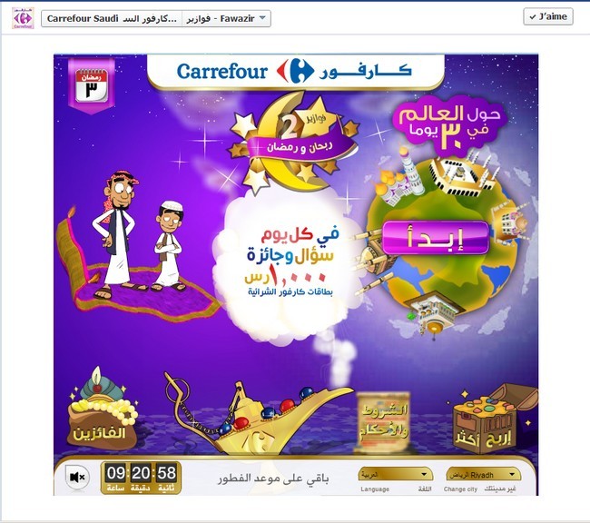 Carrefour Arabie Saoudite, ou Carrefour Saudi Arabia si l’on préfère, vient pour cette année de remettre en scène son fameux Rabhan. Déjà en 2012, ce personnage avait l’occasion de lutter contre des monstres dans le royaume des pétrodollars alors qu’en 2011 il s’agissait d’un petit « jeu d’argent » où il fallait gagner des Riyals, la monnaie saoudienne… Juillet 2013 : mois … Lire la suite