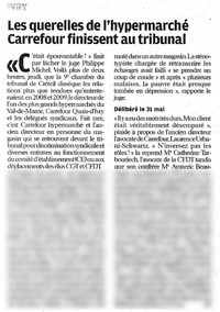 Selon un article présenté dans paris.maville.com le 22 mars 2012, à partir d’une source AFP : « Le distributeur Carrefour et l’ancien directeur de son supermarché d’Ivry-sur-Seine (Val-de-Marne) ont été jugés jeudi devant le tribunal de grande instance de Créteil pour entrave au fonctionnement du comité d’entreprise du magasin en 2007 et 2008. Le tribunal rendra sa … Lire la suite